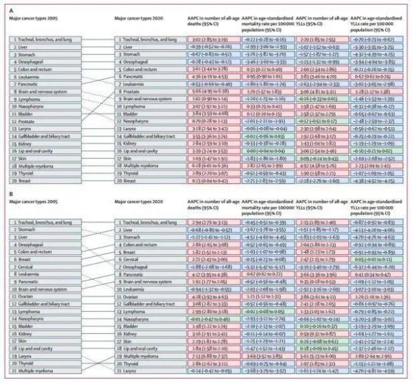 通过对中国分性别、城乡、年龄、省份23种癌症死亡和负担的近况和过去16年间的变化趋势研究,《2005-2020年中国癌症疾病负担报告》总结道,从2005年到2020年,癌症相关死亡人数和早死寿命损失年分别增长了21.6%和5.0%。
