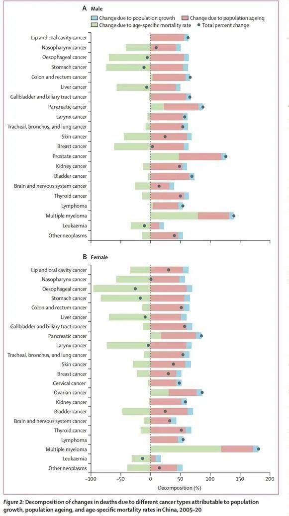 2005–2020年中国因人口增长、人口老龄化和年龄别死亡率导致的不同癌症类型死亡变化的分解分析。图/《柳叶刀》