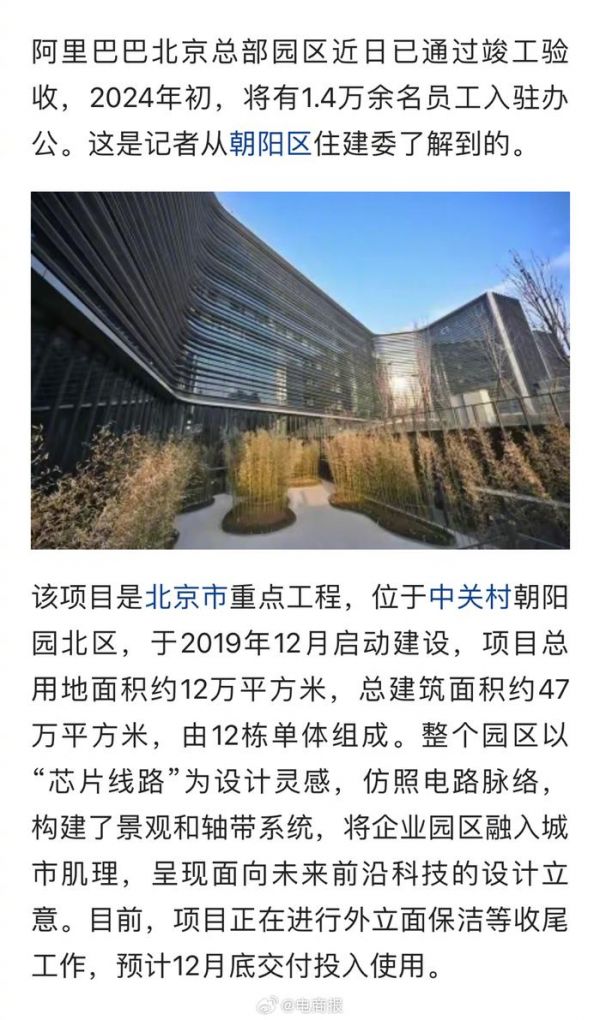阿里巴巴北京总部园区竣工,明年初将有1.4万名员工入驻办公。