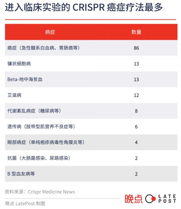 根据 Crispr Medicine News 统计,现在进入临床试验阶段的 146 项 CRISPR 疗法中,近六成用于治疗癌症,数量是镰状细胞病的近 7 倍。但癌症通常涉及多种基因突变,想要攻克可能需要更多时间。
