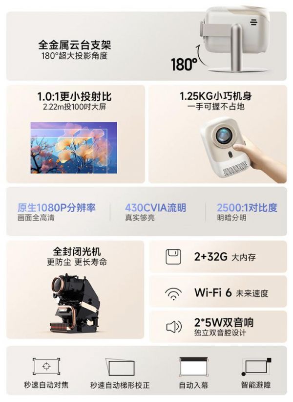▲ 图源 大眼橙官方旗舰店官方介绍称,这款投影仪自带全金属云台支架,支持 180 度旋转;采用全封闭光机,号称拥有“更长寿命”;配备 2 个 5W 音响,支持自动对焦、梯形校正。