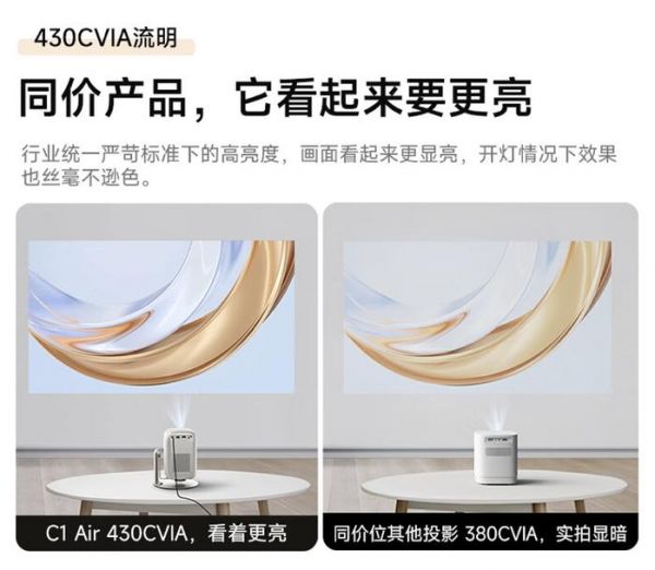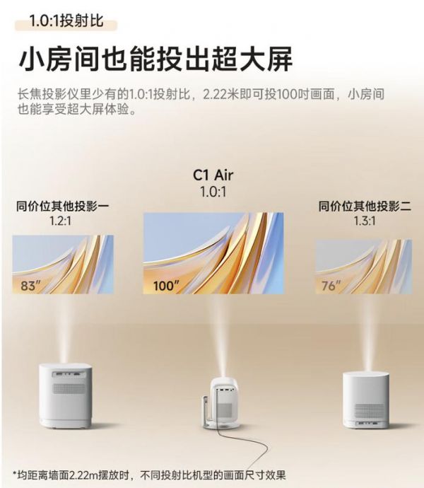 IT之家 12 月 14 日消息,大眼橙今日正式推出了 C1 Air 投影仪,这款投影仪拥有“原生 1080P 分辨率”,亮度为 430CVIA 流明,主打 1.0:1 投射比,号称“2.22m 投 100 英寸屏”,首发预售价 1199 元。