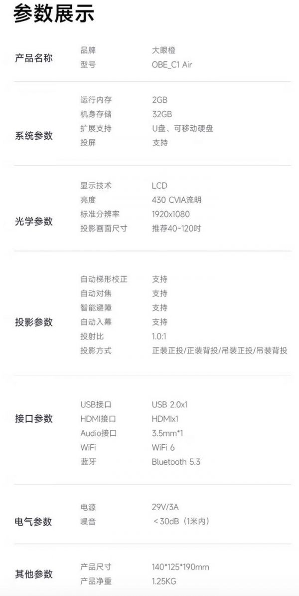 ▲ 图源 大眼橙官方旗舰店参数方面,这款投影仪重量为 1.25 千克,RAM 2GB,ROM 32GB,支持 Wi-Fi 6、蓝牙 5.3 技术;配有 1 个 HDMI 接口(官方未说明接口版本,电商平台详情页为 HDMI 1.4)、1 个 USB Type-A 2.0 接口、一个 3.5mm 音频接口。