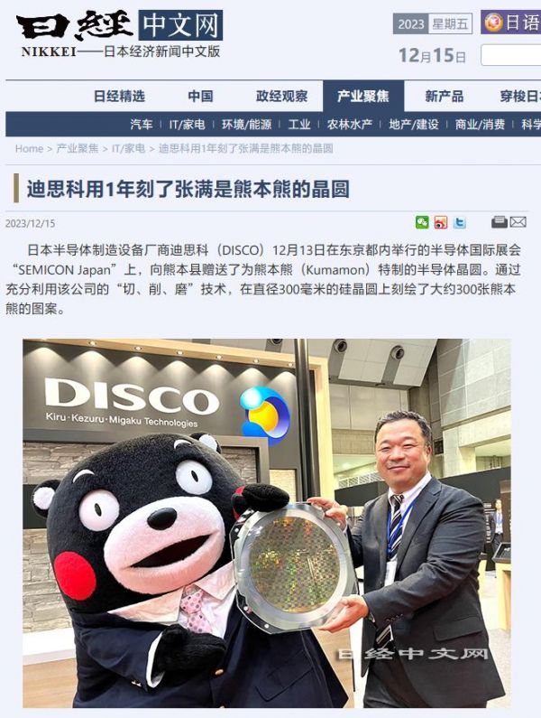 IT之家 12 月 15 日消息,据日本经济新闻报道,日本半导体制造设备厂商迪思科(DISCO)日前在东京 SEMICON Japan 半导体国际展会期间,向熊本县赠送了一块特制的半导体晶圆。