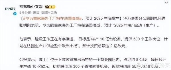 华为法国分公司副总经理张明刚表示,华为的首家海外工厂将在法国落成,预计“2025 年底”启动 (生产)。他表示,建设工作正在有序推进,目标是“年产 10 亿台设备,提供 500 个工作岗位,计划在法国生产并供应整个欧洲市场°,预计投资总额达2亿欧元。