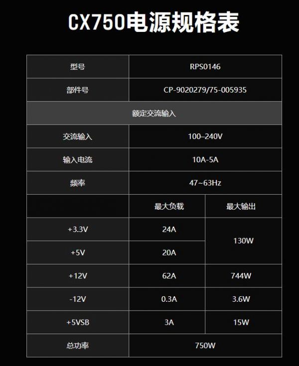 海盗船 CX 电源系列拥有 80 PLUS Bronze 认证,效率达 88%,输出为 +12V 单路,550W 为 44A,650W 为 52A,750W 为 62A,提供 24pin ATX 连接器、4+4pin EPS / ATX12V 连接器、6+2pin PCIe 连接器 x2(750W x3)、15pin SATAx3、4pin 外设 x2。