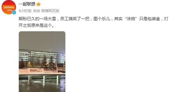 图源水印据悉,有网友表示,有人利用近期的降雪,华为LOGO被雪覆盖的机会,在华为公司的招牌上写了个“Lenovo”,也就是联想的品牌。不过,或许是由于被涂鸦的只是一个很小的招牌,所以并没有引起大量的关注,华为方面也没有什么反应。而此前,联想被涂鸦的则是联想大厦的LOGO,所以要更为显眼,才引起了一定的关注。