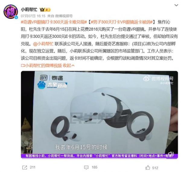 此外,小莉帮忙、1818 黄金眼等民生节目也报道了类似的情况,多位用户购买 VR 眼镜后,打卡后却没有获得相应的 E 卡返还。