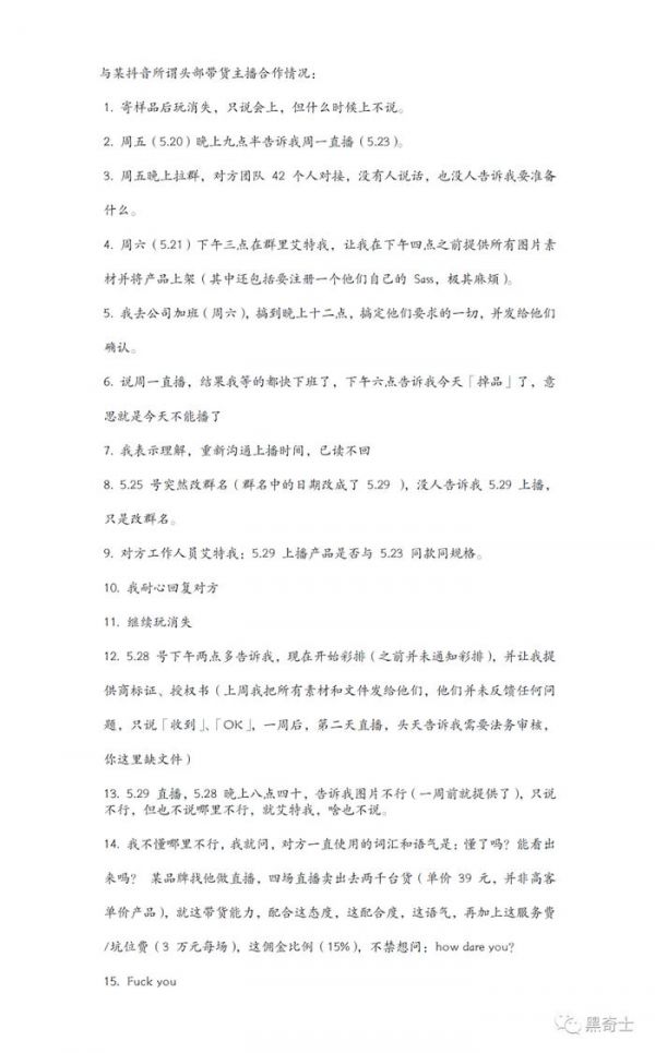 在网上看到一篇吐槽某头部主播的帖子,从细节来看,整件事情真实性很高,照录如下: