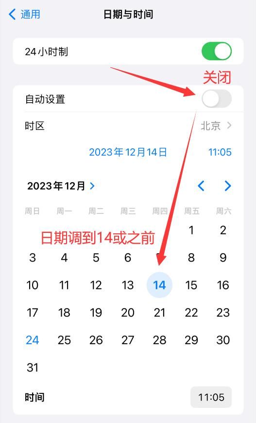 需要注意的是,这次安装屏蔽更新描述文件需要比以往多一个步骤:安装之前现打开设置--通用--时间与日期--将“自动设置”关闭,再把时间调整到2023年12月14日或者之前的日期。