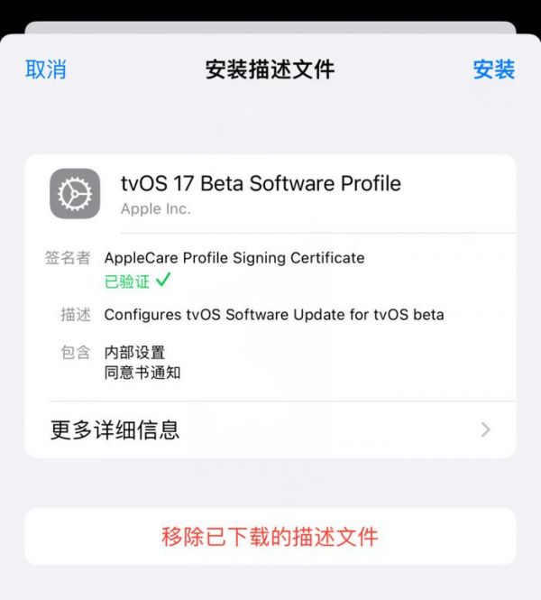 然后再复制描述文件下载链接,在Safari浏览器中打开,点击允许下载最新的tvOS 17屏蔽描述文件,再打开iPhone的设置----通用--VPN与设备管理,安装tvOS 17描述文件,根据提示重启iPhone即可。