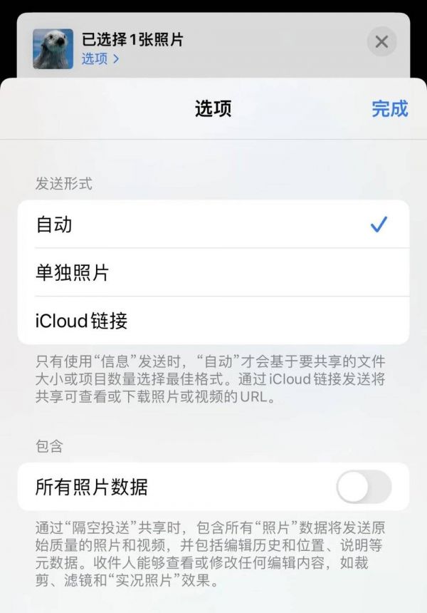 在 iOS 15 中,图片分享页面可取消勾选“所有照片数据”|作者提供