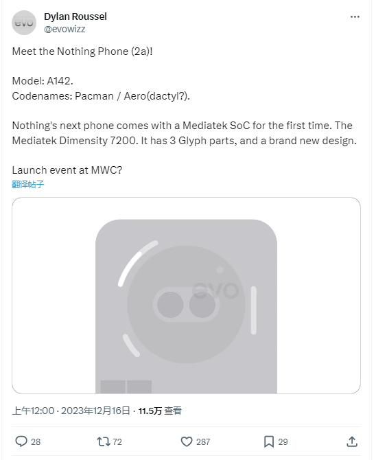 (图源:X平台)硬件配置方面,Nothing Phone 2a 搭载了联发科天玑7200芯片,手机配备6.7英寸AMOLED屏幕,刷新率为120Hz。至于拍照方面,Nothing Phone 2a的前置配备了1600万像素f/2.0自拍镜头,后置则是50MP的主摄和8MP超广角镜头。最后是系统和续航方面,Nothing Phone 2a 预装了基于安卓14的Nothing OS 2.5系统和配备了4920mAh的电池。