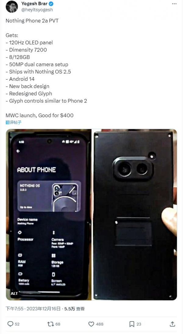 Nothing Phone 2a 手机曝光:预计 MWC 2024 发布,400 美元左右