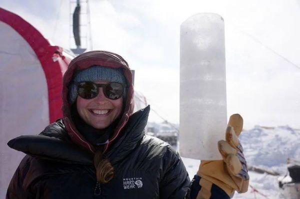 冰川地质学家Allie Balter-Kennedy拿着从格陵兰的Prudhoe Dome取出的冰芯。来源:Ryan Vachon