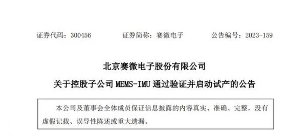 IT 之家查询发现,北京赛微电子股份有限公司 2023 年 12 月 29 日又发布关于控股子公司 MEMS-IMU 通过验证并启动试产的公告,控股子公司赛莱克斯微系统科技(北京)有限公司代工制造的某款 MEMS-IMU(Inertial Measurement Unit 的缩写,即惯性测量单元)通过了客户验证,赛莱克斯北京收到该客户发出的采购订单,启动首批 MEMS-IMU 8 英寸晶圆的小批量试生产。
