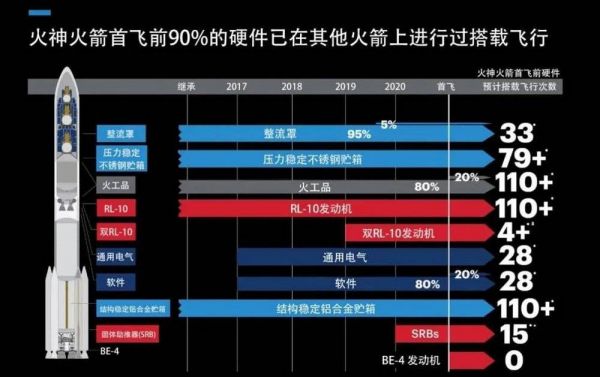 ULA公司的“宇宙神”和“德尔他”系列火箭技术经过数十年的发展,技术水平和成熟度都达到了一定高度,“火神”火箭充分利用上述型号的技术进行进一步优化升级,继承了“宇宙神”5的“半人马座”上面级、电气系统、飞行软件、整流罩和发射工位,以及“德尔他”4的5m直径芯级结构和固体助推器等。ULA公司在“火神”火箭上谨慎应用新技术和新产品,一般都经过长时间的研发和地面验证,或者通过现役“宇宙神”5火箭积累飞行试验。“火神”火箭在首飞之前,箭上90%的主要部件都在现役火箭上完成验证。