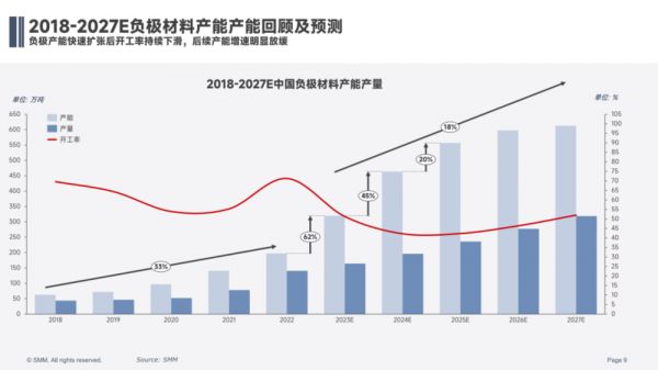 负极材料是产能过剩当中焦虑最重的环节,在2023年10月底召开的上海有色金属网SMM第十二届金属产业年会的负极材料分论坛上,与会的国内头部负极材料企业都在关注产能过剩问题。因为负极材料不像正极材料有不同的材料体系,虽然硅负极一直是负极领域的热门话题,但距离真正量产尚有距离,现在的负极市场依然是石墨的天下,品类单一加上制造门槛不高,造成了相对严重的产能过剩问题。