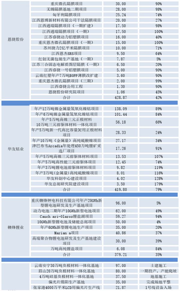 附表:电池产业相关企业重大在建、执行项目投资预算TOP10企业: