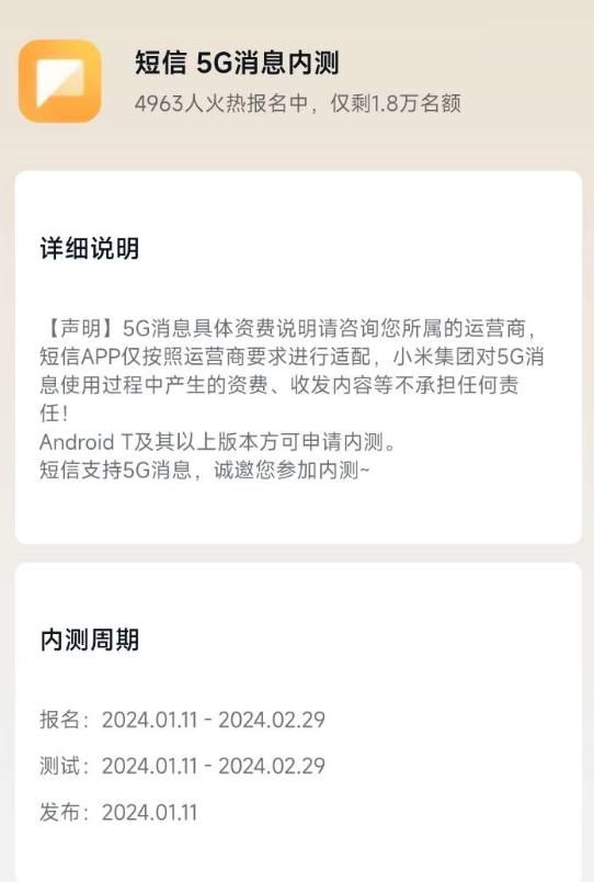 对此小米反应十分迅速,仅过去一个月时间,就在小米社区邀请用户参与5G消息内测。但小米在声明中表明短信APP仅按照运营商要求进行适配5G消息,对用户使用过程中产生的资费、收发内容等均不承担任何责任。