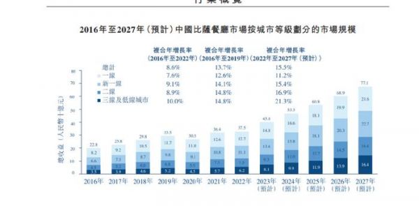 达美乐是乐观派的一员。在招股书中,达美乐中国引用了弗若斯特沙利文的数据,佐证中国比萨市场未来将以较快速度持续增长的观点——2022年至2027年,中国比萨市场收入规模预计将以15.5%的年复合增长率增长,2023年将达到458亿元,2027年将达771亿元。也就是说,近4-5年时间,中国比萨市场的规模将翻上一倍。
