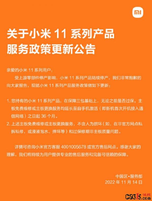 “关于小米11系列产品特殊问题服务政策”。消费者供图