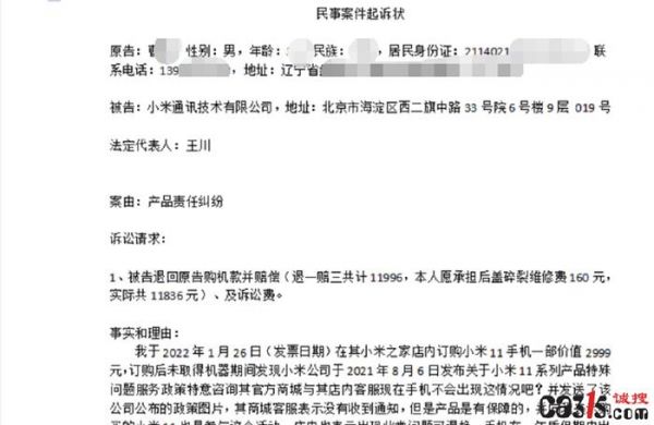 2022年1月26日,消费者曹先生在小米之家店内订购了一部价值 2999元小米11手机,在使用不到一年内,出现了WiFi断连、屏幕无法旋转、微信不计步、听筒故障、陀螺仪失灵等质量问题。