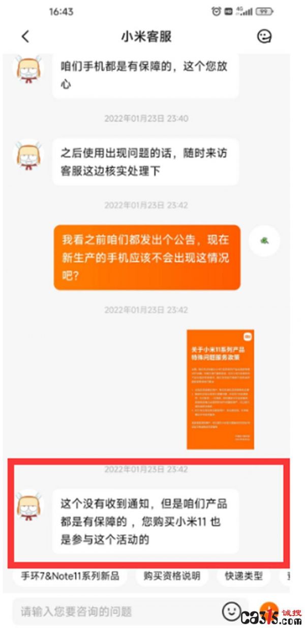 消费者曹先生告诉3.15诚搜网,在手机购买之前,同款小米11手机曾出现过大量包括WiFi断连等质量问题,可销售人员没有向他进行提示,是他在网上发现后主动询问小米官方客服,对方表示他购买的小米11享有“关于小米11系列产品特殊问题服务政策”保障。