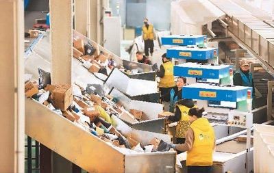 近日,在菜鸟网络山东省东营市广饶县快递集中配送中心,大型双层全自动环线交叉带分拣机正在对包裹快速分拣。该分拣系统采用5G和物联网技术等,将快递分拣时间由行业平均的每单1秒压缩到0.1秒,每小时分拣数量可达4.5万单。 周广学摄(人民视觉)