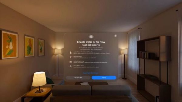 用户使用 ZEISS Optical Inserts,将眼镜夹片安装到 Vision Pro 头显之后,用户必须要把头显戴回头上,然后按下数字表冠继续操作。