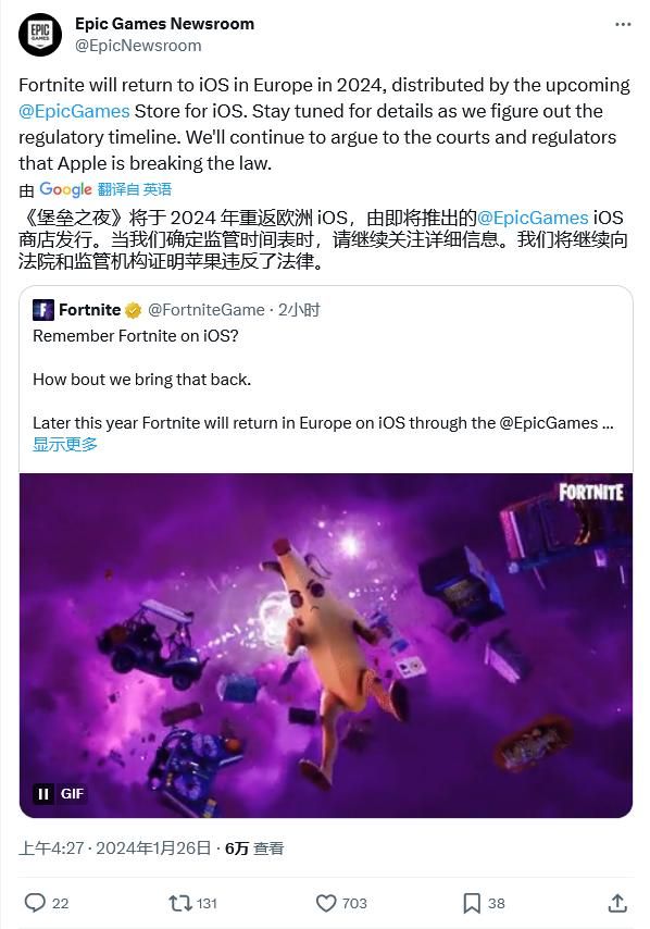 IT之家 1 月 26 日消息,Epic Games 今天发布推文,将会根据苹果公司在 27 个欧盟成员国做出的 iOS 调整,即将推出第三方应用商店,并计划今年让《堡垒之夜》游戏重返欧洲 iOS 平台。