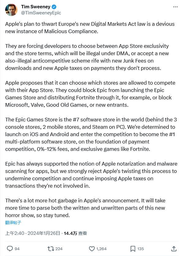 不过 Epic 首席执行官蒂姆・斯威尼(Tim Sweeney)认为苹果在欧洲做出的调整,依然只是为了应付和规避欧盟委员会的反垄断处罚,并通过“恶意合规的新手段”,阻挠《数字市场法》的实施。