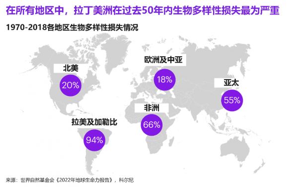 根据世界自然基金会《2022年地球生命力报告》,自1970年以来野生动物种群数量平均下降了69%。各区域生物多样性丧失程度参差不齐。