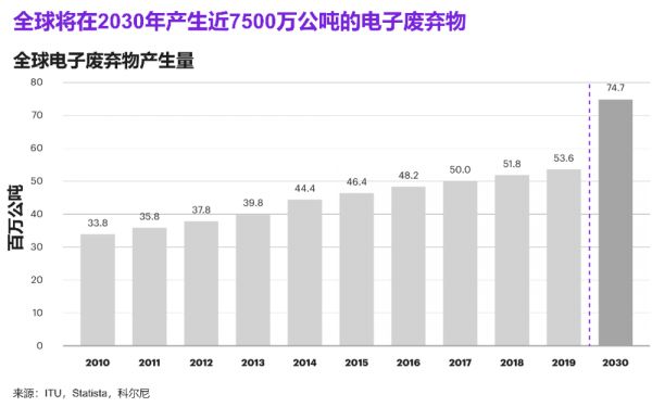 从手机和笔记本电脑到冰箱、电视等,所有带有电路或电气元件以及电源或电池电源的废弃家庭或商业物品都是全球电子废弃物快速增长的一部分。到2030年,电子废弃物的产生量预计将增长到74.7公吨,如果条件保持不变,到2050年将达到110公吨(见图7)。