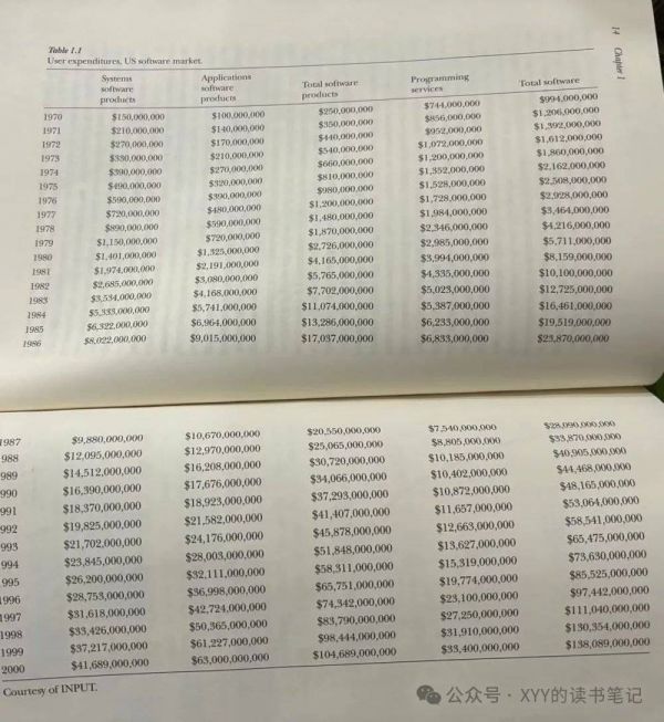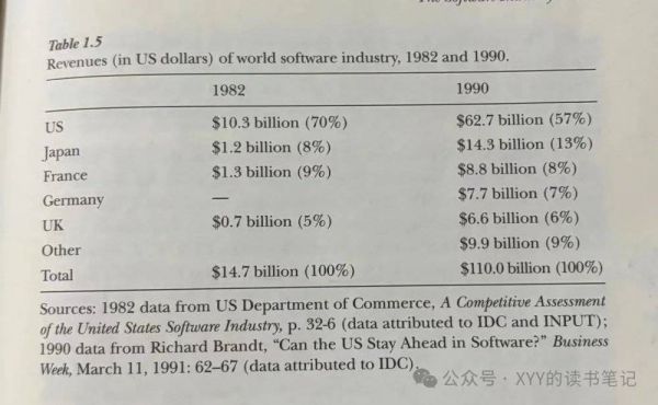 图二则可以看到非美国市场软件发展情况,从这个数据可以看出,美国市场始终是全球软件市场半壁江山,虽然1982到1990年占比有所降低。其次,非美国市场例如日本软件市场核心国内产业主要是编程服务(143亿美元里面,79亿美元是编程服务),而这些市场软件销售几乎被美国产品包办,这也是这本书虽然名为软件行业史,但实际上核心写的是美国软件产业发展史的原因。