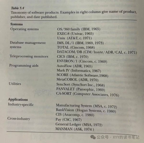 2. 应用软件,其中系统软件包括OS操作系统,编程工具等,而应用软件则是服务特定行业软件包,比如金融行业。大部分软件都需要进一步定制化开发。1960年代,IBM等大型机厂商开始为金融等特定行业开发应用程序包,比如保险行业,有200~300家保险公司采购了。