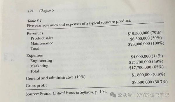 软件公司1美元收入,通常有30%~50%是销售成本,此外还有10%非销售的营销费用,20%是产品开发成本,10%支持维护成本,利润率是10%~20%(如下图)。也就是如果通常一个软件产品的寿命周期是5年(5年2~3倍ROI,20%复合),这个生意本身并不性感,然而随着部分软件寿命延长到10~15年,生意的本质开始变化。