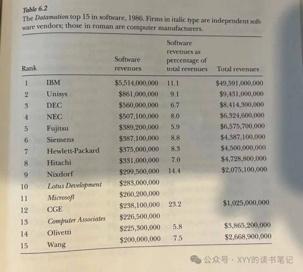 当然,IBM仍然是最大的企业软件提供商,1986年其软件收入达到55亿美元,第二名Unisys是8.6亿(也是主机厂),而独立软件厂商第一名Lotus(主要是ToC)营收才2.8亿美元,微软是2.6亿美元(微软的软件收入规模1998年才超过IBM)。
