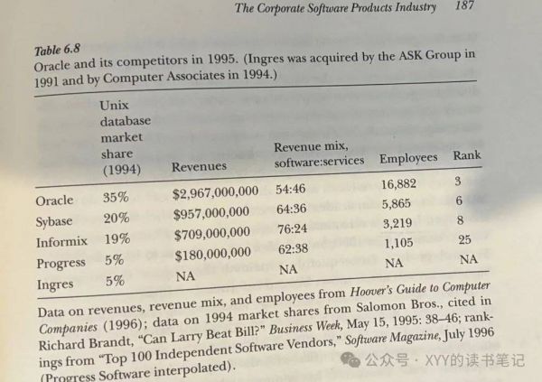 此外,行业也开始出现很多并购活动,每年有100~200笔并购交易,例如Computer Associates就靠并购成为行业最大玩家之一。本章,作者主要从行业整合(并购,Computer Associates),相关性数据库发展(Oracle为主)和ERP行业发展(SAP)三个主要赛道发展来呈现企业软件赛道成熟进程。