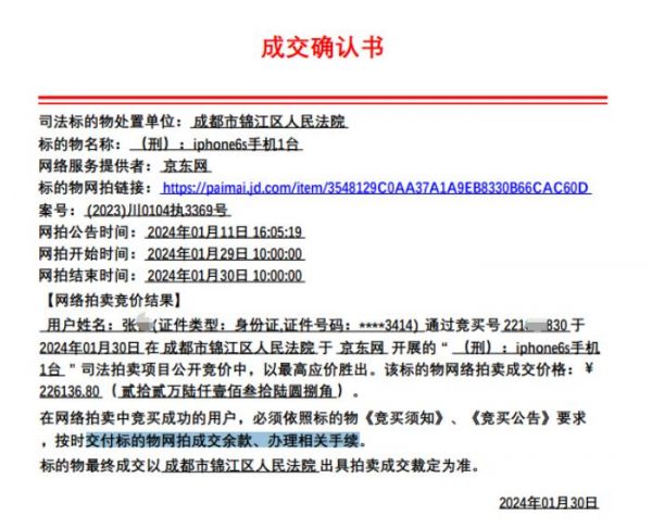 成交确认书介绍本次网络拍卖的竞价结果:一名张姓拍卖人通过竞买号221655830于 2024年01月30日在成都市锦江区人民法院于京东网开展的“ (刑):iPhone6s手机1台”司法拍卖项目公开竞价中,以最高应价胜出。