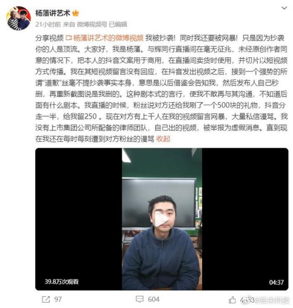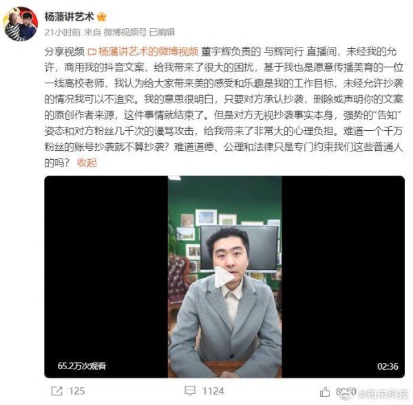 近日,在抖音上拥有230多万粉丝的博主“杨藩讲艺术”发布两条视频称,与辉同行直播间大规模抄袭自己的文案。