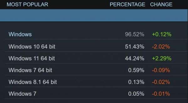 在 Steam 调查中,Windows 11 至少有一处表现出色。最新版本的操作系统在调查中的用户份额达到了创纪录的 44.2%,而 Windows 10 则下降了 2%,为 51.4%。看来用不了多久,就会有一半的参与者使用 Windows 11。