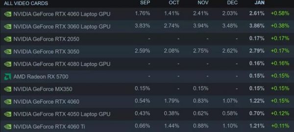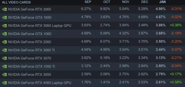 1 月份无疑说明游戏笔记本电脑越来越受欢迎。RTX 4060 笔记本电脑 GPU 表现最出色,上涨了 0.58 个百分点,其次是 RTX 3060 笔记本电脑 GPU(上涨了 0.38 个百分点)。RTX 4080 笔记本 GPU 排名第五,RTX 4050 笔记本 GPU 排名第九。