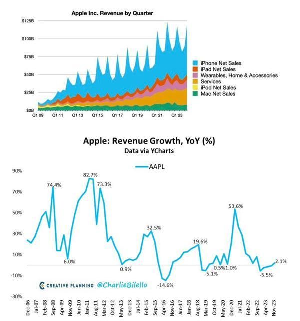 苹果发布的 2024 财年第 1 财季财报显示,营收 1196 亿美元(每天平均净赚约 26.5 亿元),同比增长 2%;摊薄后每股收益为 2.18 美元,同比增长 16%。