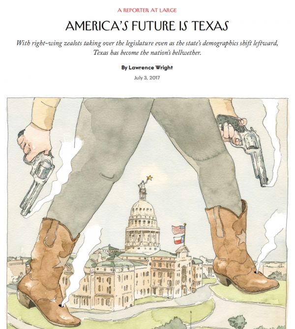 我一生中的大部分时光都在得州度过,逐渐对这个州所象征的意义产生了敬意,无论是对居住在这里的人们还是从旁观者的角度。得州人认为自己是美国最佳品质的化身:友好、自信、勤奋、爱国、无神经症。局外人士将得州视为美国的核心,是一个狂放不羁、否认现实的冲动肆虐之地。人们认为,得州人盲目地崇尚个人主义,将政府视为削弱企业家力量的最大障碍。得州人被认为是吹牛者;对金钱和个人生活不屑一顾;容易上当受骗,但一旦犯错则就疑心重重;缺乏安全感,却沉迷于权力和威望。