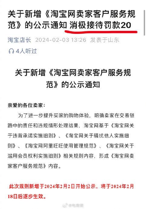 淘宝又要出新规了,客服消极回复一单将罚20元