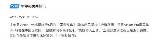 IT之家 2 月 6 日消息,据华尔街见闻今天中午报道,供应链人士声称,苹果 Vision Pro 最早将于 4 月在中国区发售,“最晚时间不晚于 5 月”。