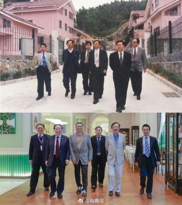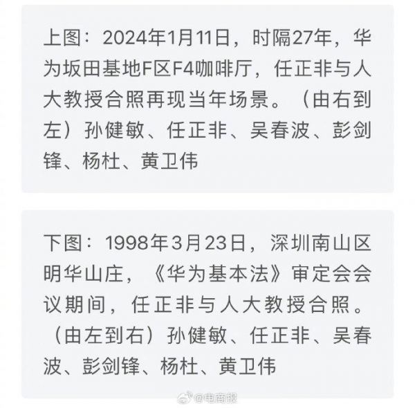 华为任正非亲自招待,起草《华为基本法》团队再相聚,一起摆拍复原27年前一起散步的场景,讨论企业管理问题。