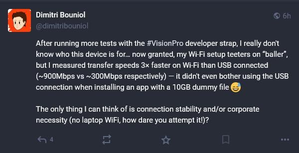 开发者 Bouniol 在 Mastodon 分享了该设备的使用体验,认为性价比并不高,他在动态帖子中表示:“苹果 Vision Pro 头显在 System Profiler 中显示为‘复合设备’(Composite Device),且仅限于 USB 2.0 速度”。