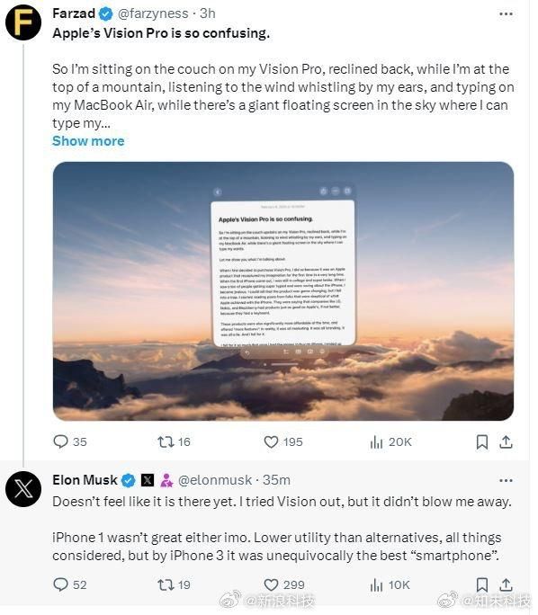 2月7日,据新浪科技,马斯克在X平台上回应了一位用户对苹果MR头显Vision Pro的评论。这位用户在帖子的最后总结道:“这就是我对苹果Vision Pro的感觉。这是未来,但现在还没到。”马斯克回应称:“感觉还没到那一步。我试过Vision了,但它并没有让我震惊。”不过,马斯克接着说:“iPhone 1在我看来也不怎么样。考虑到所有因素,它的实用性比其他替代品要低,但到了iPhone 3,它无疑是最好的‘智能手机’。”